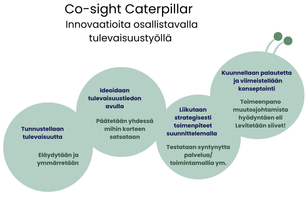 Co-Sight Caterpillar-malli ohjaa organisaatioiden tulevaisuuskestävien innovaatioiden muotoilemista. Se hyödyntää osallisuutta, vaikuttamista ja empatiaa korostavaa ennakointi- ja muotoiluajattelua, sekä ennakoinnin ja muotoilun menetelmiä ja prosesseja.