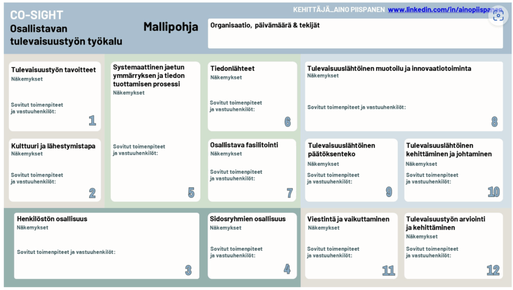 Kehitin ratkaisevan työkalun organisaatioiden osallistavan tulevaisuustyön suunnitteluun, kehittämiseen ja arviointiin.